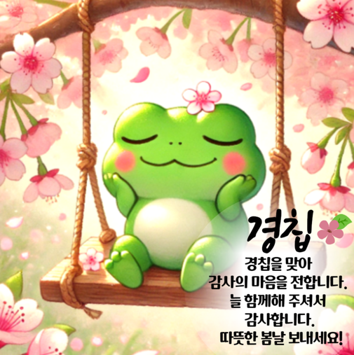 โœ” ๊ฒฝ์นฉ์„ ๋งž์•„ ์ƒˆ๋ด„์˜ ๊ธฐ์šด์„ ์ „ํ•ฉ๋‹ˆ๋‹ค. ๋ฐ์€ ์—๋„ˆ์ง€๋กœ ๊ฐ€๋“ํ•œ ํ•˜๋ฃจ ๋ณด๋‚ด์‹œ๊ณ , ๋Š˜ ํ–‰๋ณต๊ณผ ํ–‰์šด์ด ํ•จ๊ป˜ํ•˜์‹œ๊ธธ ๋ฐ”๋ž๋‹ˆ๋‹ค.