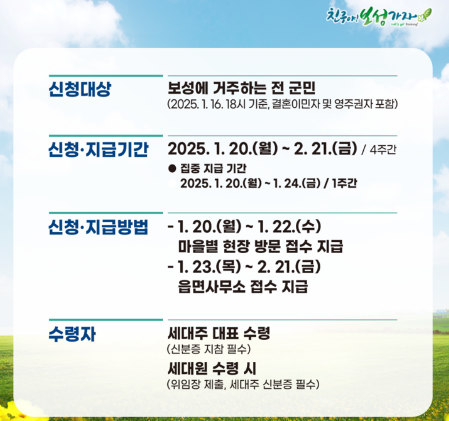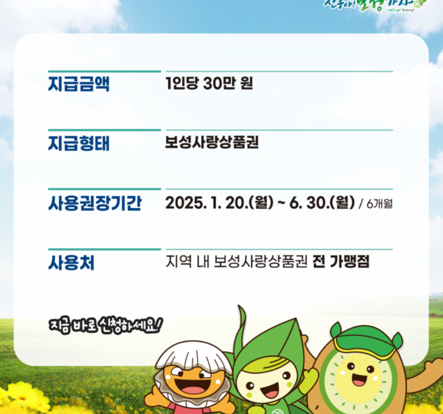 ๋ณด์ฑ์ฌ๋์ง์๊ธ์ ์ง์ญ ํํ์ธ ๋ณด์ฑ์ฌ๋์ํ๊ถ์ผ๋ก ์ง๊ธ๋๋ฉฐ, ๋ณด์ฑ๊ตฐ ๋ด ์ง์ ๋ ๊ฐ๋งน์ ์์๋ง ์ฌ์ฉ์ด ๊ฐ๋ฅํฉ๋๋ค.