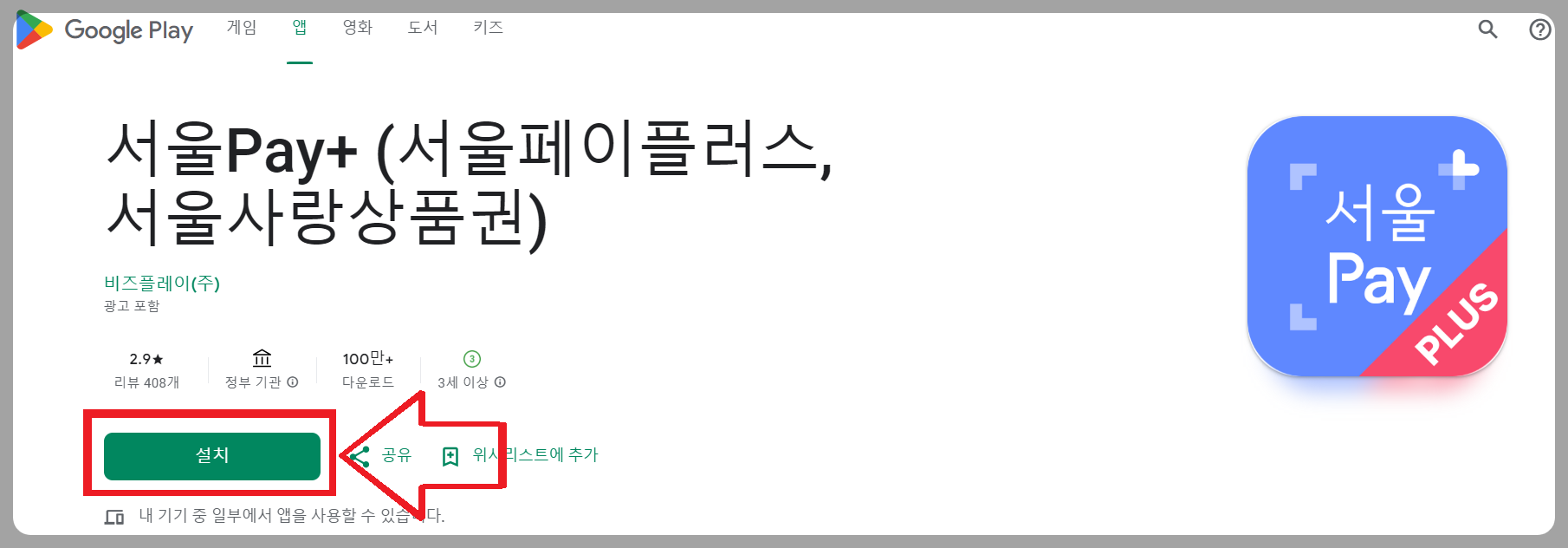 3. 검색 κ²°κ³Όμ—μ„œ μ„œμšΈνŽ˜μ΄ ν”ŒλŸ¬μŠ€ μ•± 선택 ν›„ μ„€μΉ˜
