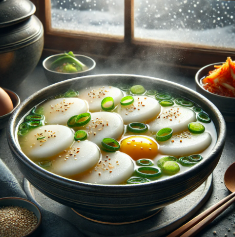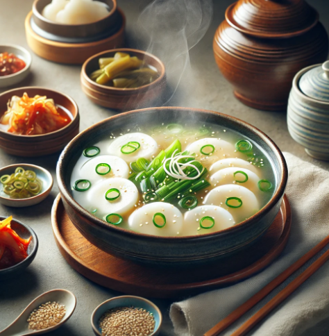 ๋–ก๊ตญ์€ ์ƒˆํ•ด๋ฅผ ๊นจ๋—ํ•˜๊ณ  ํฌ๋ง์ฐจ๊ฒŒ ๋งž์ดํ•˜๊ธฐ ์œ„ํ•œ ์ „ํ†ต ์Œ์‹์ž…๋‹ˆ๋‹ค. ํ•˜์–—๊ณ  ๊ธด ๊ฐ€๋ž˜๋–ก์€ ์ˆœ์ˆ˜ํ•จ๊ณผ ์žฅ์ˆ˜๋ฅผ, ๋™๊ทธ๋ž—๊ฒŒ ์ฐ๋ฆฐ ๋–ก์˜ ๋ชจ์–‘์€ ํ’์š”์™€ ๋ณต์„ ์ƒ์ง•ํ•ฉ๋‹ˆ๋‹ค.