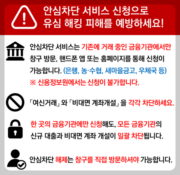 ๐๋ฏธ๋ฆฌ ๋๋นํ์ ์ 2์ฐจ ๊ธ์ตํผํด๊ฐ ์ผ์ด๋์ง ์๋๋ก ์ฌ์ ๊ฑฐ๋ ์์ฌ์ฐจ๋จ ์๋น์ค ์ ์ฒญ์ ์๋๋ฌ์ฃผ์ธ์!