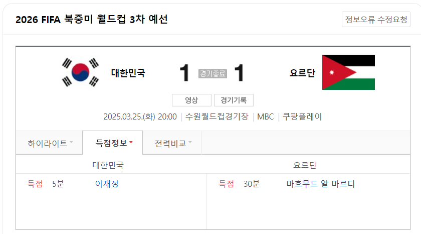 โ ๊ฒฝ๊ธฐ ๊ฒฐ๊ณผ: ํ๊ตญ 1 - 1 ์๋ฅด๋จ (์ ๋ฐ์ : 1-1)