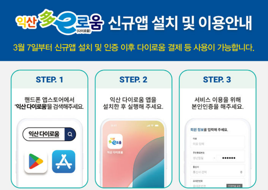 μ΅μ‚°μ‹œμ˜ 지역화폐 "읡산 λ‹€μ΄λ‘œμ›€(倚eλ‘œμ›€)"이 2025λ…„ 3μ›”λΆ€ν„° μƒˆλ‘­κ²Œ κ°œνŽΈλ©λ‹ˆλ‹€! κΈ°μ‘΄ 'μ°©ν•œνŽ˜μ΄' μ•±μ—μ„œ μ‹ κ·œ μ•± ‘읡산 λ‹€μ΄λ‘œμ›€’으둜 λ³€κ²½λ˜λ©°, λ‹€μ–‘ν•œ κΈ°λŠ₯κ³Ό ν˜œνƒμ΄ 좔가될 μ˜ˆμ •μž…λ‹ˆλ‹€.