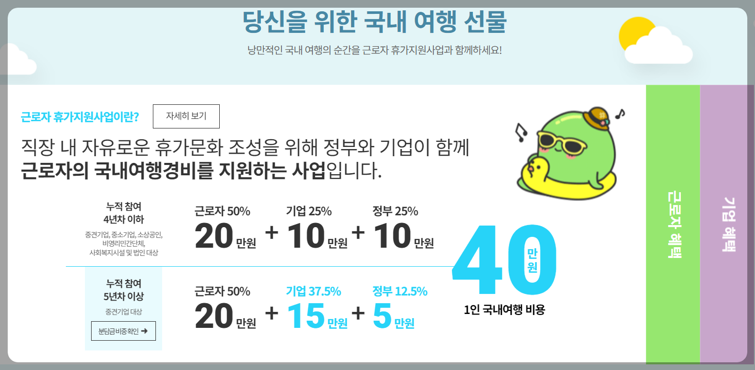 μ λΆμ κΈ°μ μ΄ ν¨κ» κ·Όλ‘μλ€μ μ¬ν λΉμ©μ μ§μν΄μ£Όλ μ¬μ μ λλ€. κ·Όλ‘μκ° 20λ§ μμ λΆλ΄νλ©΄, μ λΆμ κΈ°μ μ΄ κ°κ° 10λ§ μμ© μΆκ°ν΄ μ΄ 40λ§ μμ μ 립κΈμ΄ μκΉλλ€! μ΄ κΈμ‘μΌλ‘ μλ°, κ΅ν΅, κ΄κ΄μ§ μ μ₯κΆ λ±μ ꡬ맀ν μ μμ΅λλ€.
