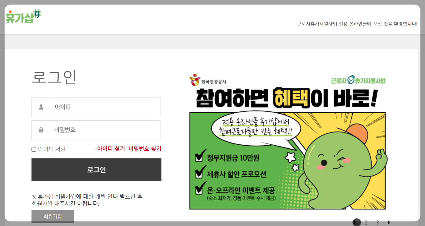 ν΄κ°μ΅μ κ·Όλ‘μ μ¬νκ²½λΉ μ§μμ¬μ μ°Έμ¬ κ·Όλ‘μλ§ μ΄μ©ν μ μλ μ μ© μ¨λΌμΈλͺ°μ΄μμ. μ΄ νμλͺ°μμλ μλ°, κ΄κ΄, κ΅ν΅, ν¨ν€μ§ μ¬ν λ± 20λ§μ¬ κ°μ κ΅λ΄ μ¬ν μνμ μ 곡ν©λλ€.