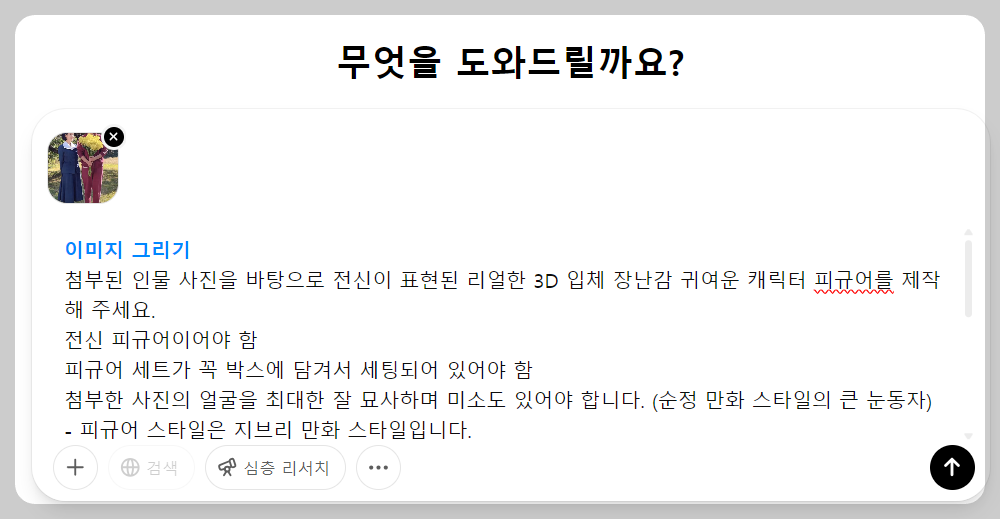 ์ผ์ ๋ฃ์ด์ฃผ๋ฉด ๋ ์ข์ต๋๋ค. ์ด ์ธ ๋จ๊ณ๋ฅผ ๊ฑฐ์น๋ฉด, ์ฑGPT๊ฐ ์ง์ง ํผ๊ท์ด์ฒ๋ผ ๋ณด์ด๋ 3D ์บ๋ฆญํฐ ์ด๋ฏธ์ง๋ฅผ ๋ง๋ค์ด์ค์!