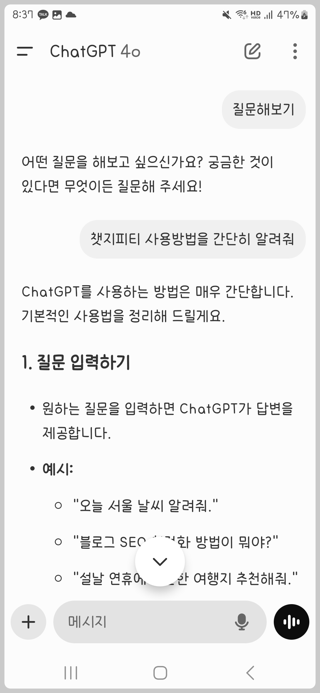 - ์ฑํ ์ฐฝ์ ์ง๋ฌธ์ ์ ๋ ฅํ๋ฉด ์ฑGPT๊ฐ ๋ต๋ณ์ ์ ๊ณตํฉ๋๋ค.