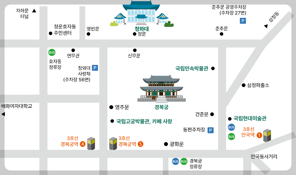 ์ง€ํ•˜์ฒ ์—ญ ๋„๋ณด ๋™์„ , ์ฒญ์™€๋Œ€ ์…”ํ‹€๋ฒ„์Šค ์šด์˜ ์‹œ๊ฐ„ํ‘œ, ๋งˆ์„๋ฒ„์Šค ๋…ธ์„ , ์ฃผ์ฐจ์žฅ ์ •๋ณด๊นŒ์ง€ ํ•œ๋ˆˆ์— ๋ณด๊ธฐ ์‰ฝ๊ฒŒ ์ •๋ฆฌํ•ด๋“œ๋ฆด๊ฒŒ์š” ๐Ÿ˜Š