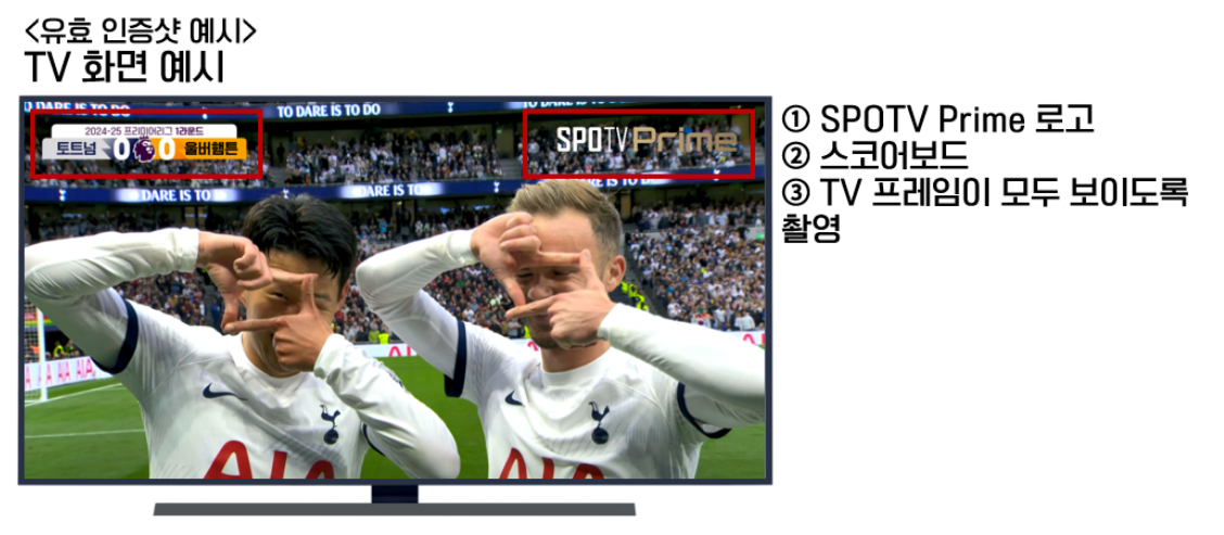 ์ธ์ฆ์ท์๋ SPOTV Prime ๋ก๊ณ , ์ค์ฝ์ด๋ณด๋, TV ํ๋ฉด์ด ํฌํจ๋์ด์ผ ์ ํจํฉ๋๋ค.