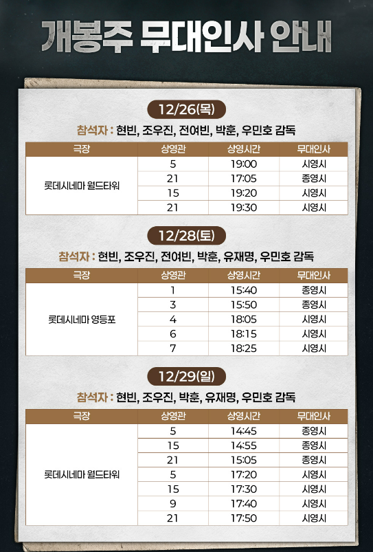 ํŠนํžˆ ์ธ๊ธฐ ๋ฐฐ์šฐ๋“ค์˜ ๋ฌด๋Œ€์ธ์‚ฌ ์ผ์ •์ด 12์›”๋ถ€ํ„ฐ 1์›”๊นŒ์ง€ ์ง„ํ–‰๋ฉ๋‹ˆ๋‹ค. ์•„๋ž˜ ์ผ์ •ํ‘œ๋ฅผ ํ™•์ธํ•˜์‹œ๊ณ , ์˜ˆ๋งค๊ฐ€ ์—ด๋ฆฌ๋Š” ์ฆ‰์‹œ ๋งˆ๊ฐ๋  ๊ฐ€๋Šฅ์„ฑ์ด ํฌ๋‹ˆ ์„œ๋‘˜๋Ÿฌ ์˜ˆ๋งคํ•˜์„ธ์š”!