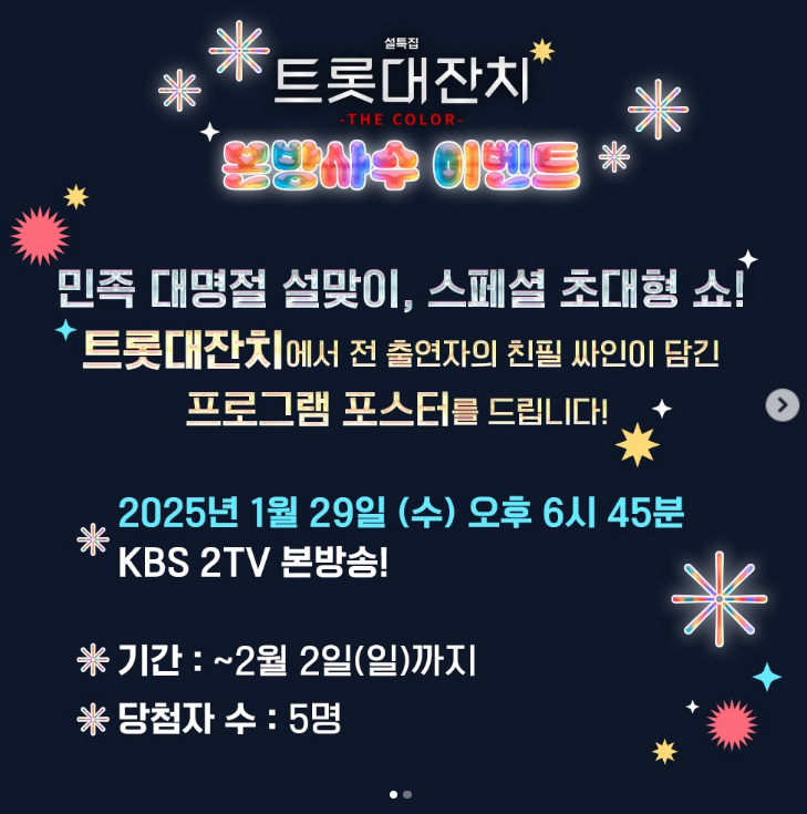 2025๋…„ ์„ค๋‚ , 'KBS ์„คํŠน์ง‘ ํŠธ๋กฏ๋Œ€์ž”์น˜ THE COLOR'๋Š” ์„ธ๋Œ€๋ฅผ ์ž‡๋Š” ํŠธ๋กœํŠธ ๋ฌด๋Œ€์™€ ๋‹ค์ฑ„๋กœ์šด ์—ฐ์ถœ๋กœ ๋ชจ๋‘์—๊ฒŒ ํŠน๋ณ„ํ•œ ๋ช…์ ˆ ์ถ”์–ต์„ ์„ ์‚ฌํ•  ๊ฒƒ์ž…๋‹ˆ๋‹ค.